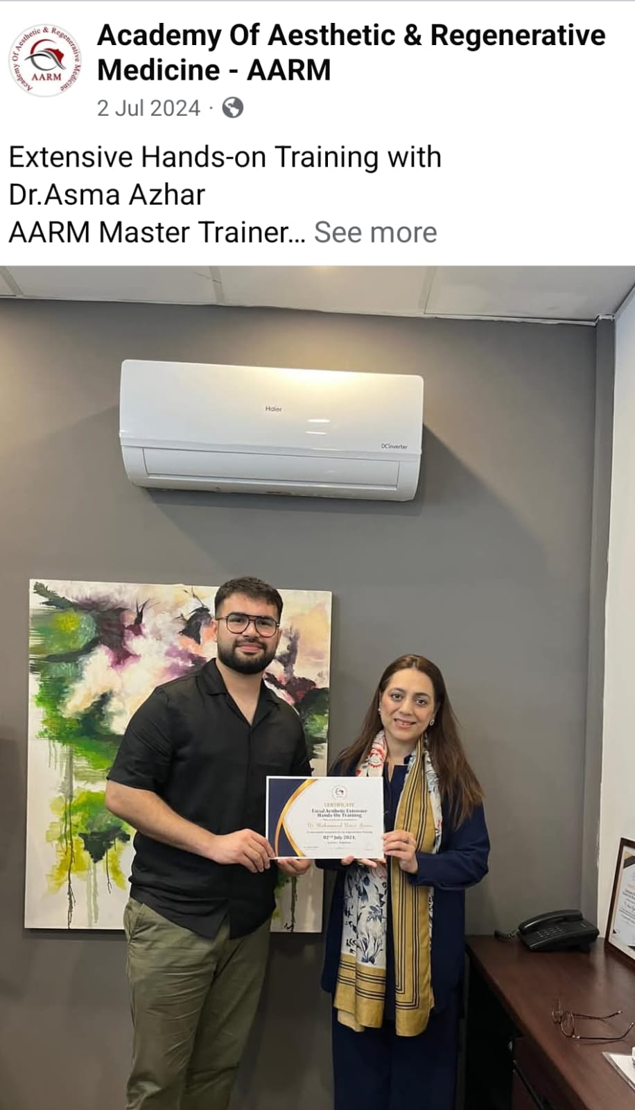 Dr. Asma currently serves as a Faculty Member at the Association of Aesthetic and Regenerative Medicine (AARM) and at the Certificate in Aesthetic Medicine (CAM) program at the University of Lahore, where she is actively involved in educating the next generation of aesthetic practitioners. Her dedication to continuous learning, ethical practice, and aesthetic precision makes her a trusted name in the industry. With a commitment to delivering natural, confidence-boosting results, she blends medical knowledge with artistic vision to ensure every patient receives personalized, high-quality care.